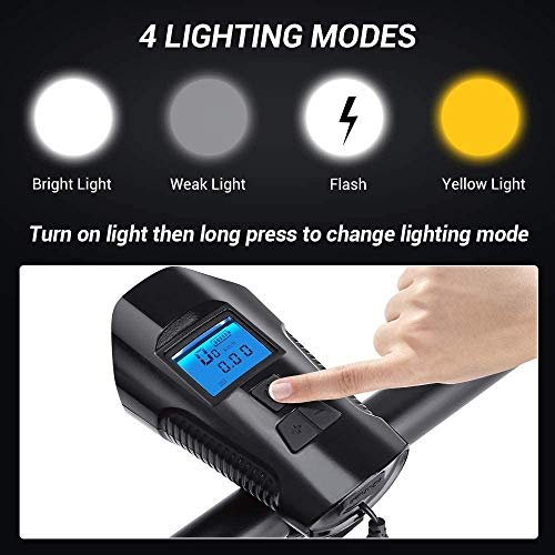 • 【‍LCD Monitor & Bike Bell】– The bike headlight with bike speedometer odometer is used to record speed. distance and riding time. 5 modes to switch–ODO. DST. MXS. AVS. TM. Comes with a bike horn with 6 sound modes to choose. it can emit a warning sound up to 120 dB.