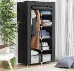 A complete and versatile clothes and shoe organizer which is ideal for use anywhere as an additional portable wardrobe (home. camping. travel. etc.). This fabric wardrobe has a plastic and steel frame and protects clothing from dust or from outside dirt. It has a roll-up door with zipping. a rail for hanging clothes hangers and shelves for placing clothes. shoes. accessories. etc. It can be cleaned easily with a damp cloth.