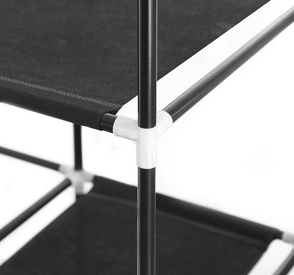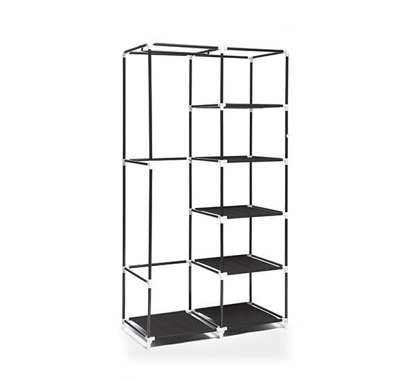 A complete and versatile clothes and shoe organizer which is ideal for use anywhere as an additional portable wardrobe (home. camping. travel. etc.). This fabric wardrobe has a plastic and steel frame and protects clothing from dust or from outside dirt. It has a roll-up door with zipping. a rail for hanging clothes hangers and shelves for placing clothes. shoes. accessories. etc. It can be cleaned easily with a damp cloth.