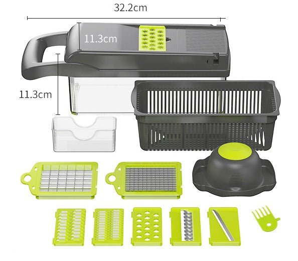 • 7-IN-1 MANDOLINE SLICER AND CHOPPER offers the functionality of multiple kitchen tools with 8 interchangeable cutting blades. Free-up space on your counter top and use just 1 easy kitchen gadget. FDA AND LFGB standard approved and BPA Free. This compact slicer and dicer measures just 31.8cm x 11.5cm x 11.5cm . It can be fully disassembled for easy cleaning on the top shelf of your dishwasher.